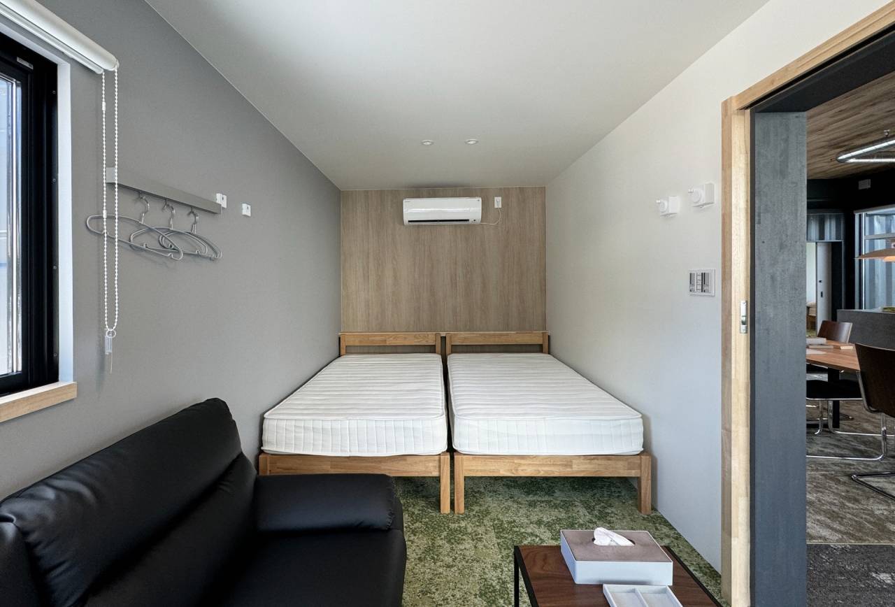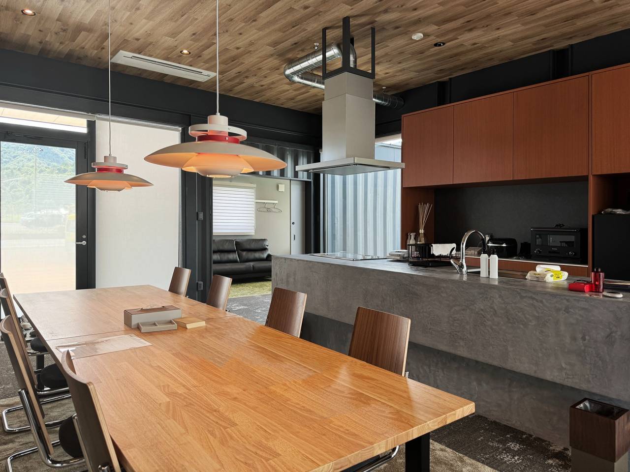 また、コンテナに囲まれた共用リビングスペースには、設備の整ったキッチンと大きなダイニングテーブルを設置し、家族や友人との楽しい時間を過ごせるスペースを提供。さらに、無柱設計の広いリビングは、用途に応じてフレキシブルに活用でき、宿泊施設利用者のライフスタイルに合わせた自由な使い方が可能となっています。
